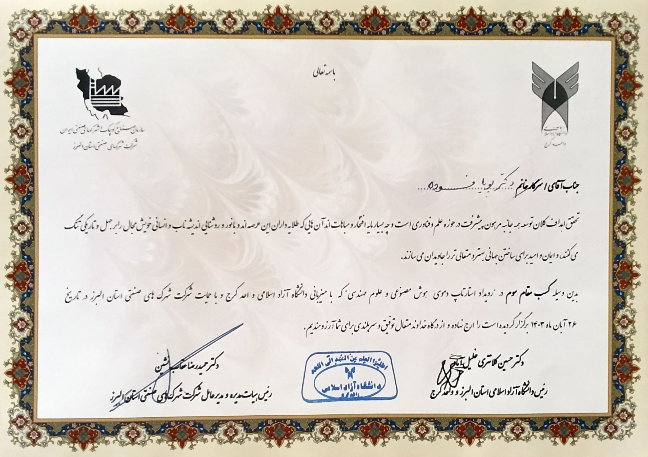 کسب مقام در رویداد استارتآپ دموی هوش مصنوعی و علوم مهندسی (سازمان صنایع کوچک و شهرکهای صنعتی) آبان 1403