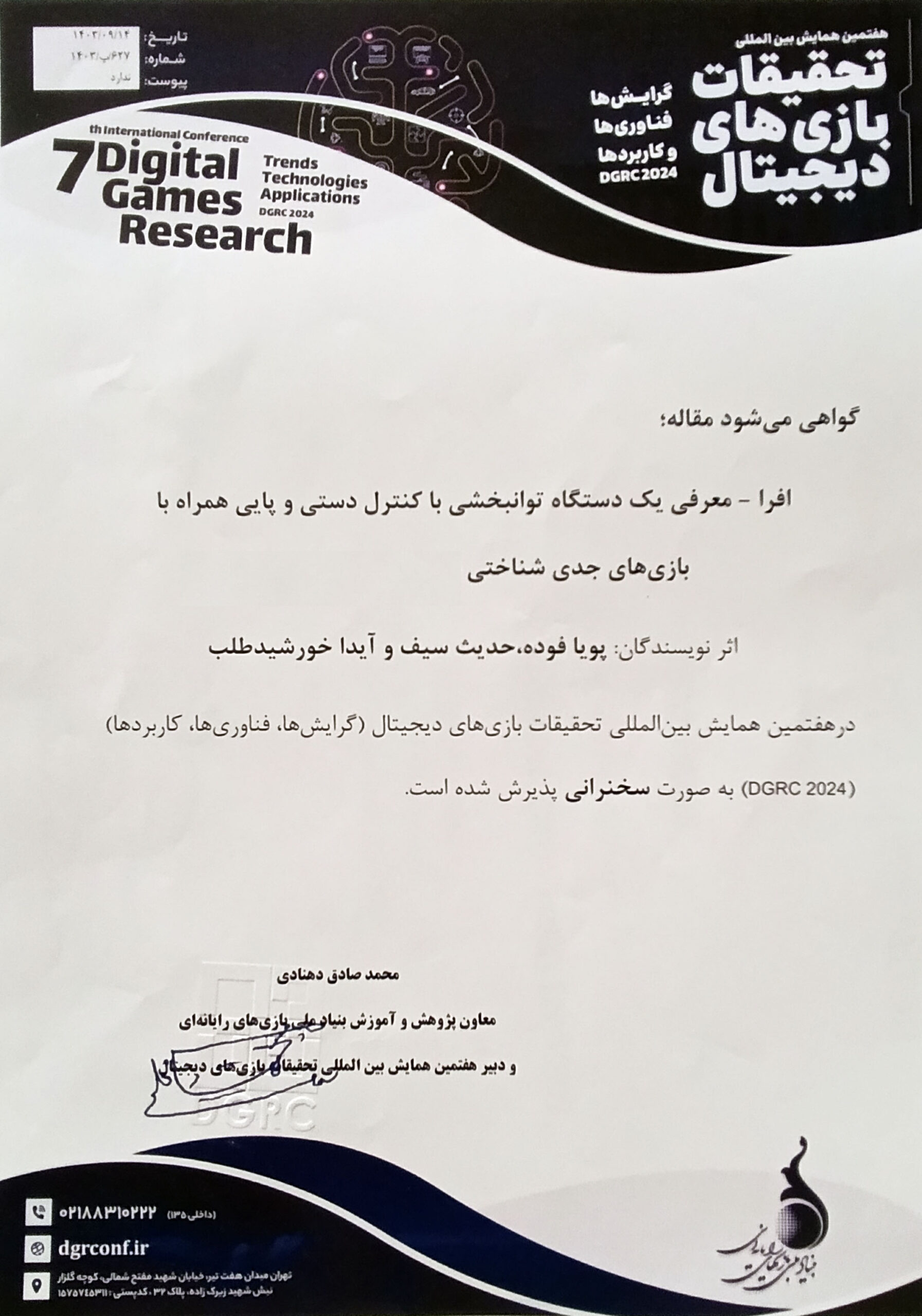 ارائه مقاله در هفتمین همایش بینالمللی تحقیقات بازیهای دیجیتال (دانشگاه علامه طباطبایی) آذر 1403