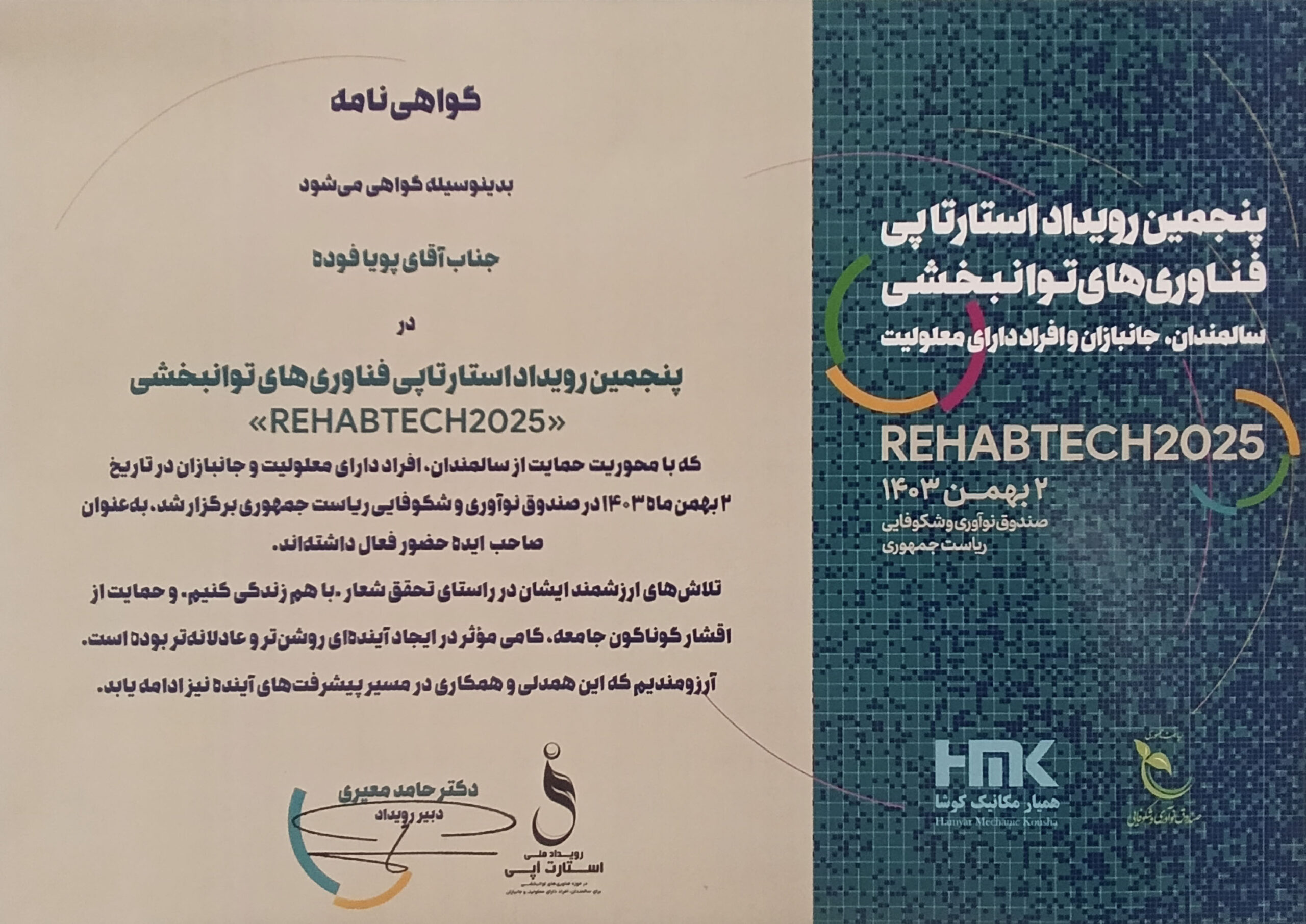 حضور و انتخاب میان ده پروژه برتر در پنجمین رویداد استارتآپی فناوریهای توانبخشی سالمندان، جانبازان و افراد دارای معلولیت (صندوق نوآوری و شکوفایی ریاست جمهوری) بهمن 1403
