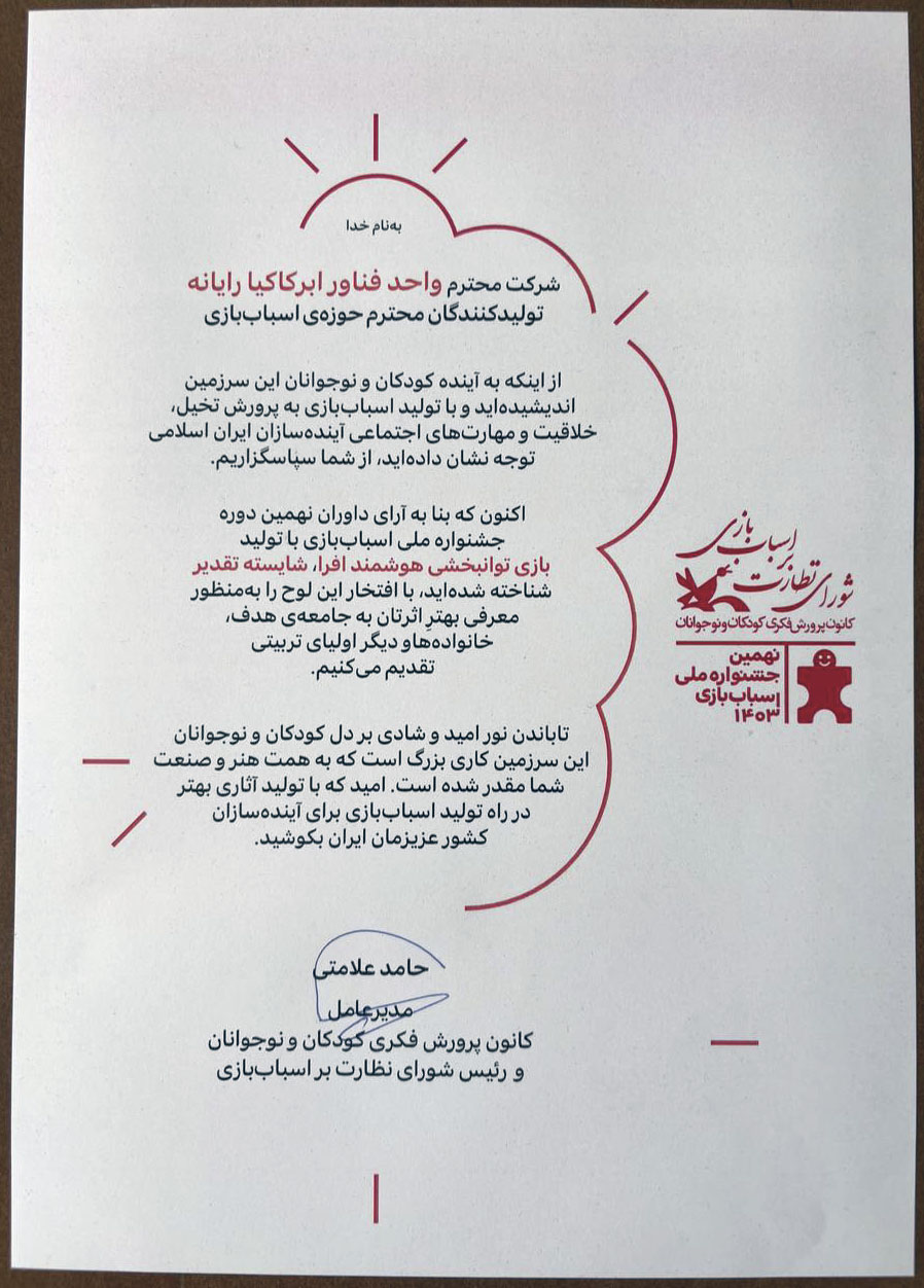 برگزیده به عنوان اسباببازی برتر درمانی ایران در جشنواره ملی اسباببازی (کانون پرورش فکری کودکان و نوجوانان) دی 1403