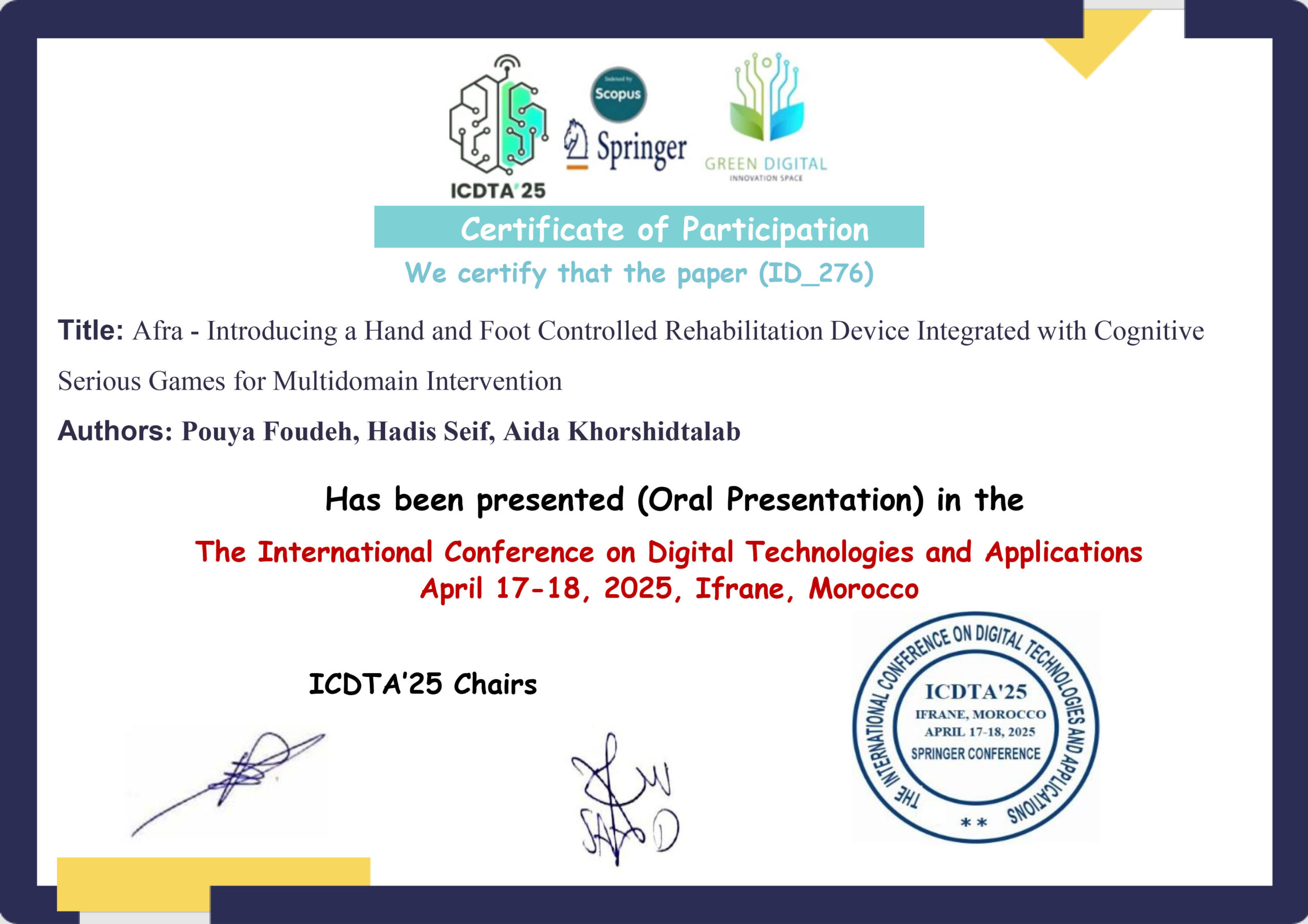 ارائه مقاله در ICDTA'25 کنفرانس بینالمللی فنآوریهای دیجیتال و کاربرد آنها (کنفرانس Springer) آوریل 2025 اردیبهشت 1404 کشور مراکش