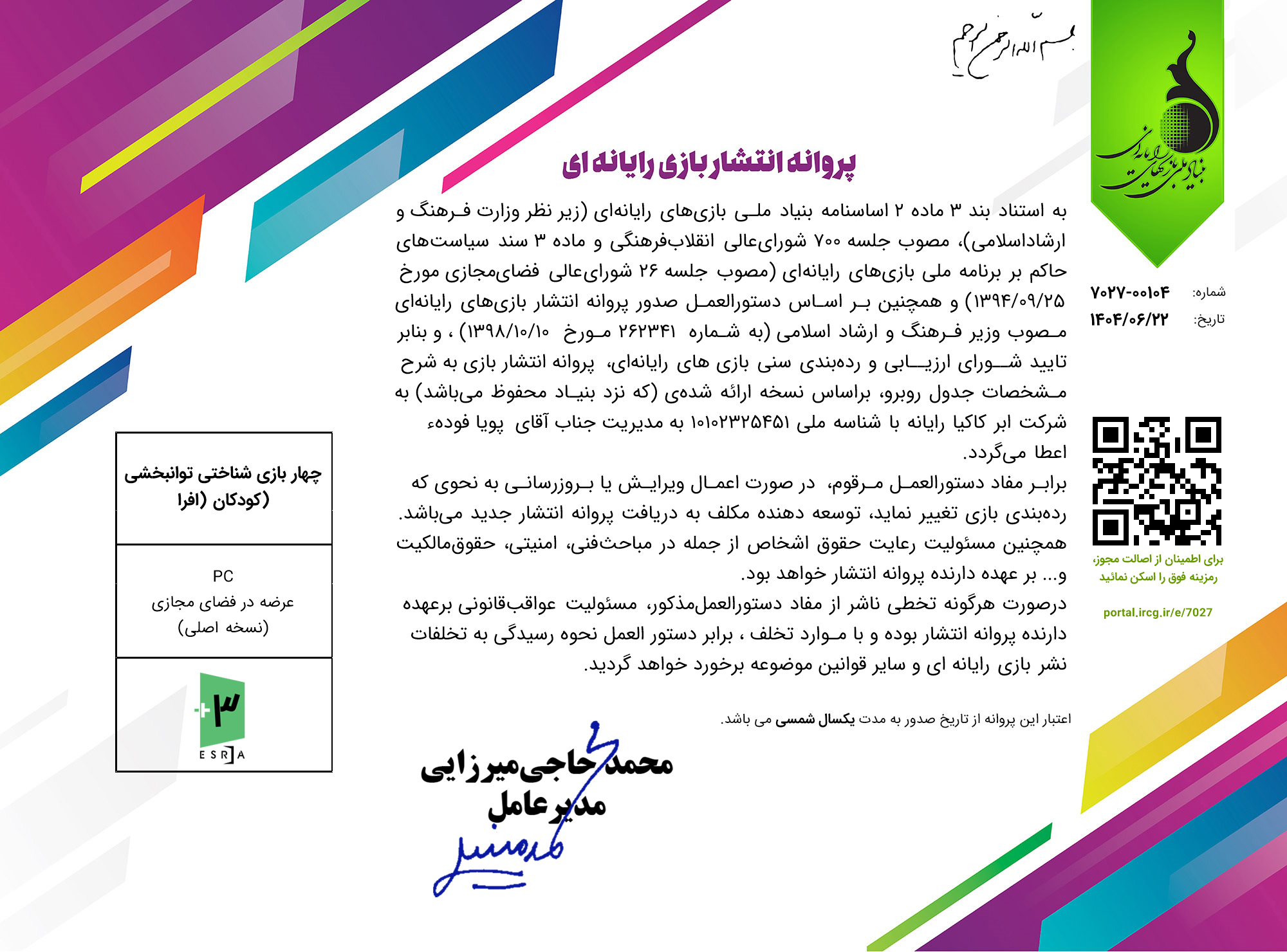 پروانه انتشار بازی از بنیاد بازیهای رایانهای