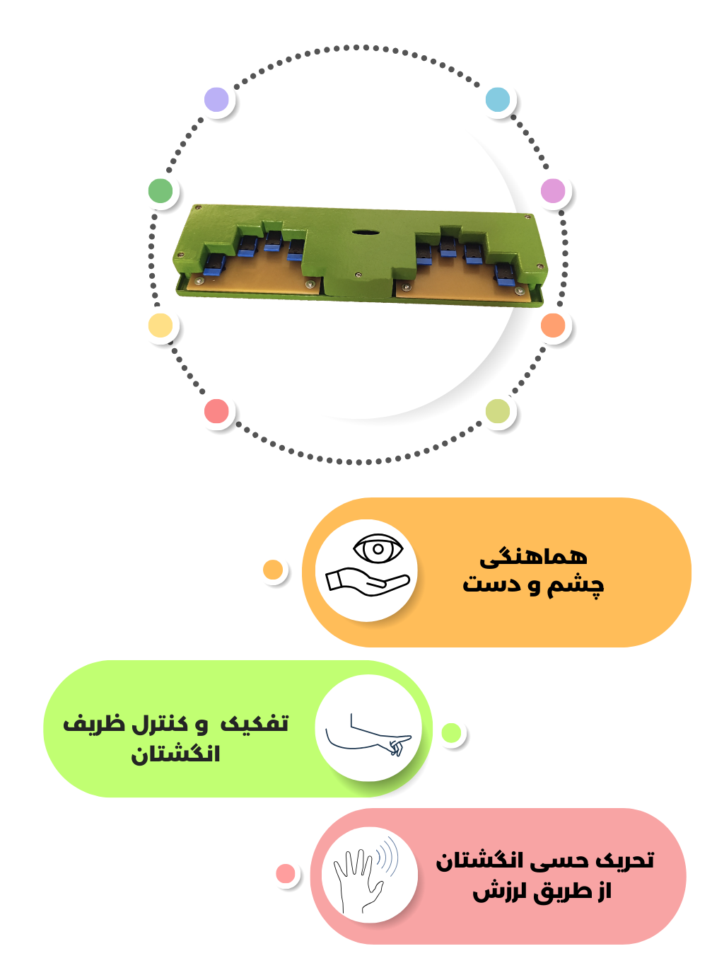 سکوی دستی شامل دو برد که هرکدام دارای چهار دکمه فشاری و یک ویبراتور است. انگشتان کاربر بصورت راحت و ریلکس روی دکمهها مستقر میشود و با فشردن هر یک از آنها، اشیای موجود در بازی را کنترل میکند و با بلرزش دگمههای زیر انگشتان هر دست به شخص سیگنال داده میشود. دستگاه روی یک فرش کوچک قرار داده میشود تا از ایجاد صدای بلند و آسیب زدن به سطح زیر آن جلوگیری شود. این دستگاه توسط تیم تحقیقاتی ما طراحی شده است.